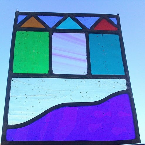 Bright beautiful and great fun; 3 little beach huts lined up on the shore, all made from recycled glass and made using traditional leading techniques to a high standard. I have acid etched cute little fish and waves in the sea and this bright seaside scene will look great hanging or leaning in any window!