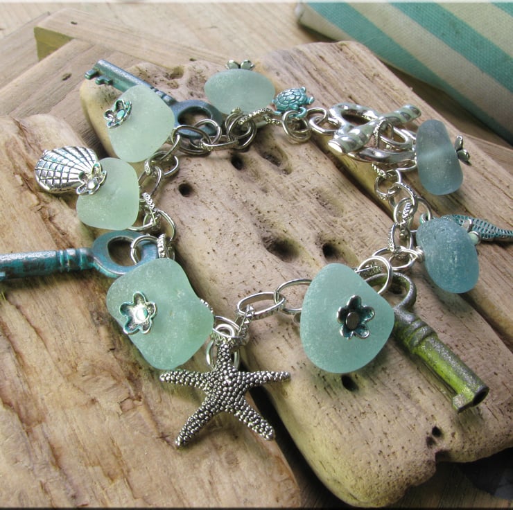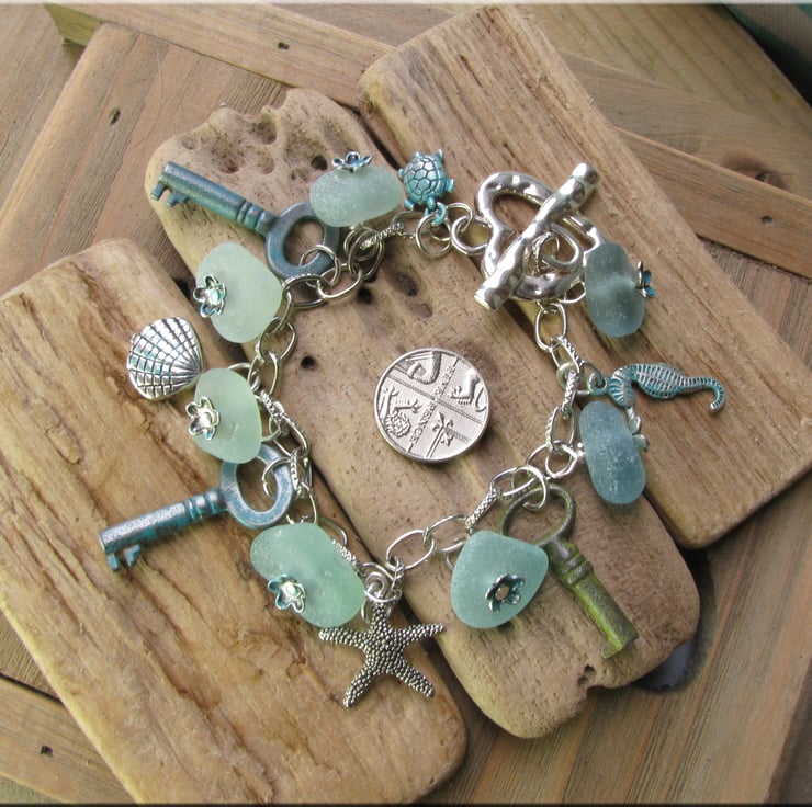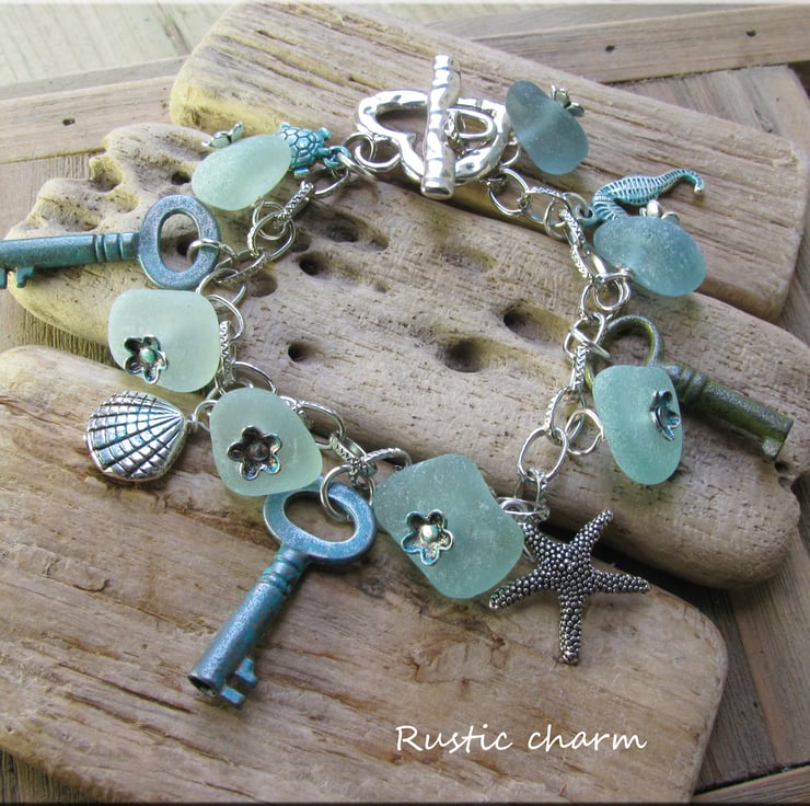 A lovely 'rustic' style charm bracelet made from a selection of beautiful aqua coloured nuggets of sea glass with silvertone flower bead caps, various sea life charms and vintage 'real' keys which have been coloured with verdigris and moss metal paint and scuffed off to give a vintage look. Finished with a beautiful silver tone heart toggle clasp.