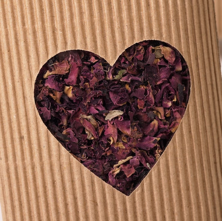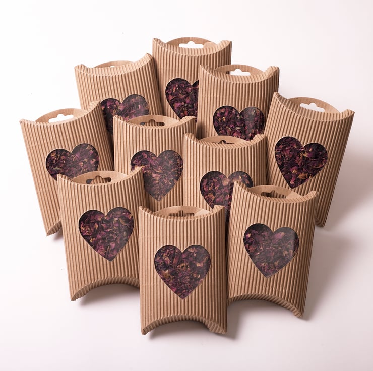 Dried rose petal confetti is packaged in kraft paper pouches with clear heart shaped window.