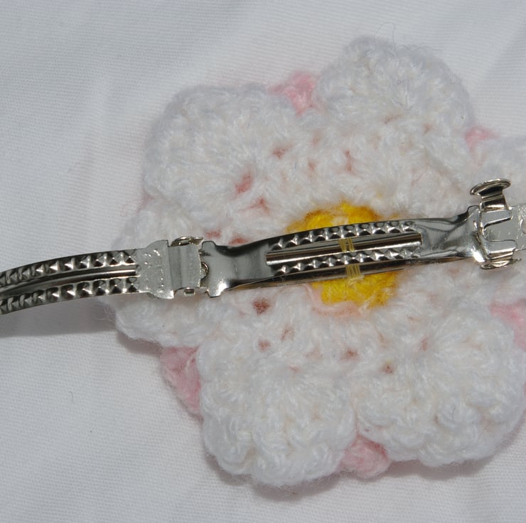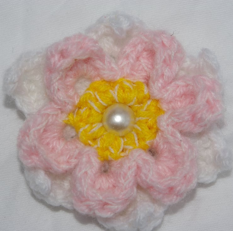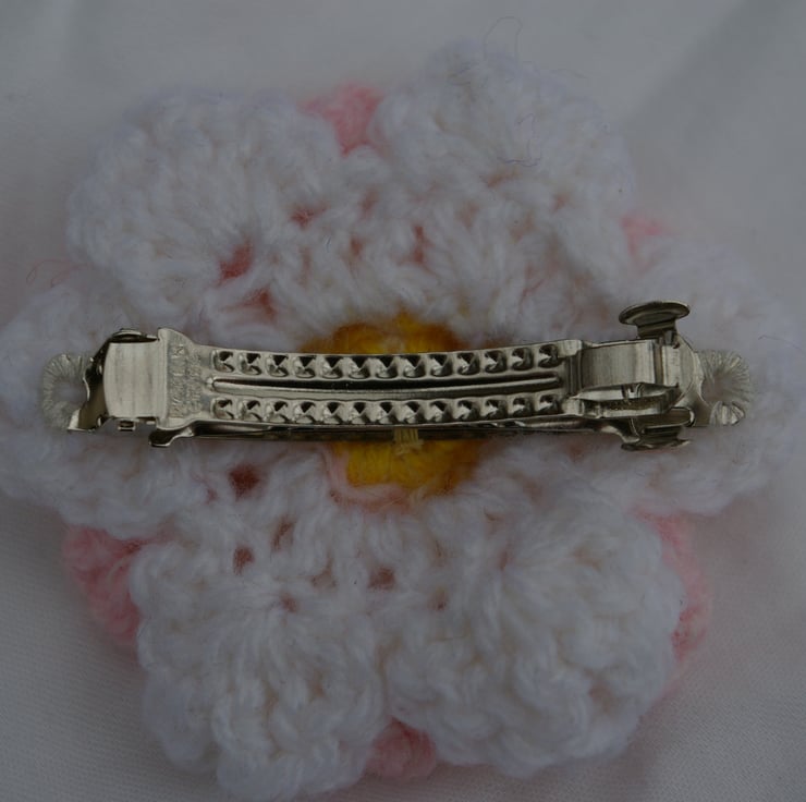 A pretty hand crocheted flower hair clip. The hair clip is hand crocheted in pink, white and yellow yarns. There are two layers of petals to this hair clip. The outer layer has white petals while the inner layer has pink petals. There are six petals to each layer.