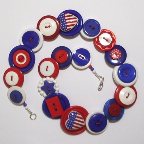 This distinctive button necklace is rich with an assortment of red, white and blue buttons.