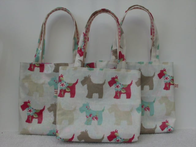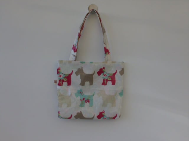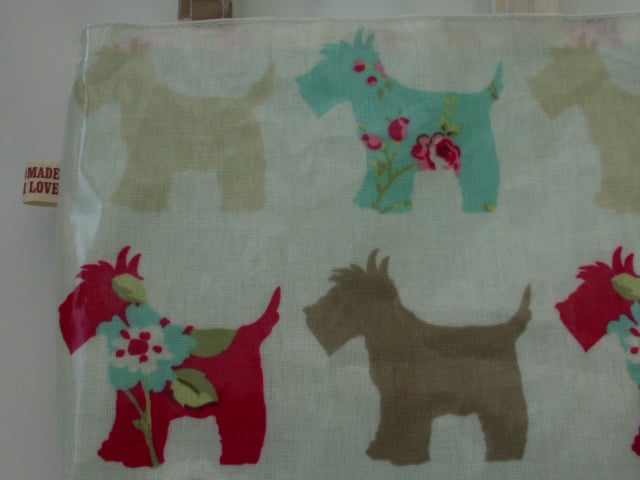 This little girls bag is made from 100%cotton coated pvc fabric . The scottie dogs are in duck egg blue , light brown, fawn and cerise pink with rose flowers on a white back ground. The bottom of the bag has a 2 inch base. This fabric can be cleaned with a damp cloth or wet wipe.