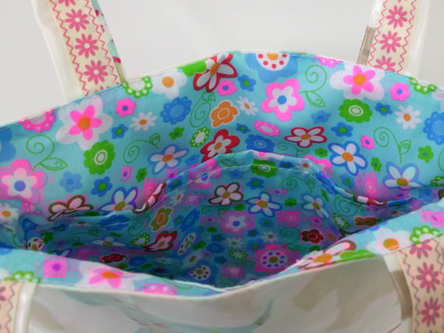 The handles are made from the same pvc fabric, on the inside of the handle they are stitched down the middle with a ribbon tape in cream with pink daisy flower print and a zigzag pattern on the edges.