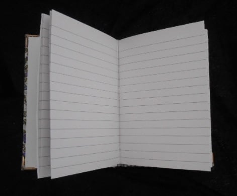 A lovely little notebook with 120 lined pages. This notebook has a padded cover which is hand covered with two fabrics of contrasting designs, a purple floral pattern and a grey stripe.
