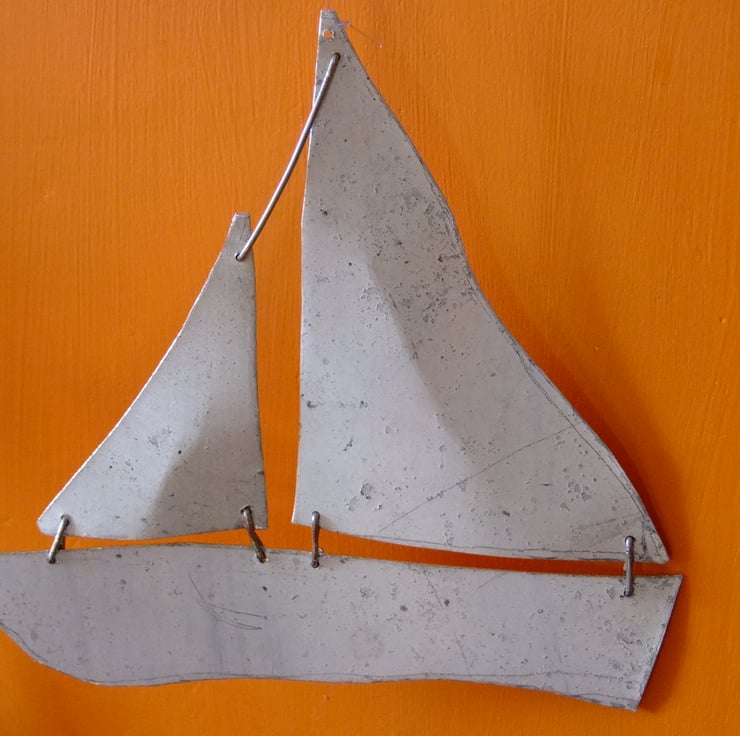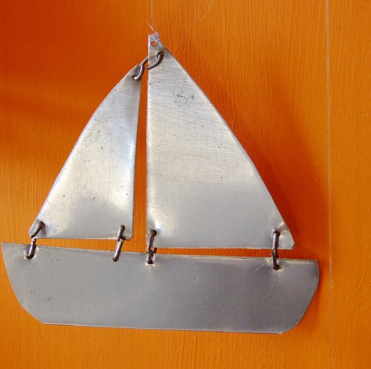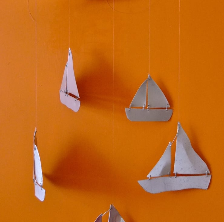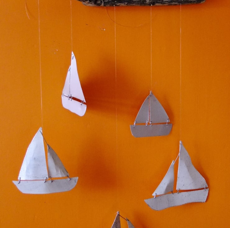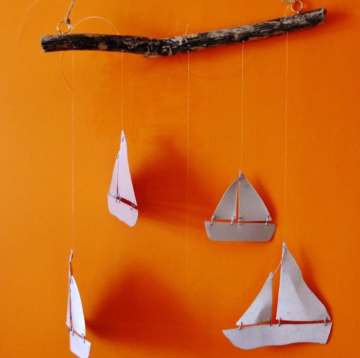 I thought that it might be an idea to make some crude and simple yachts and eventually made this mobile for decoration. The wood is a piece of Cornish driftwood.
