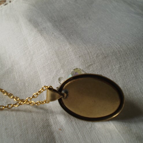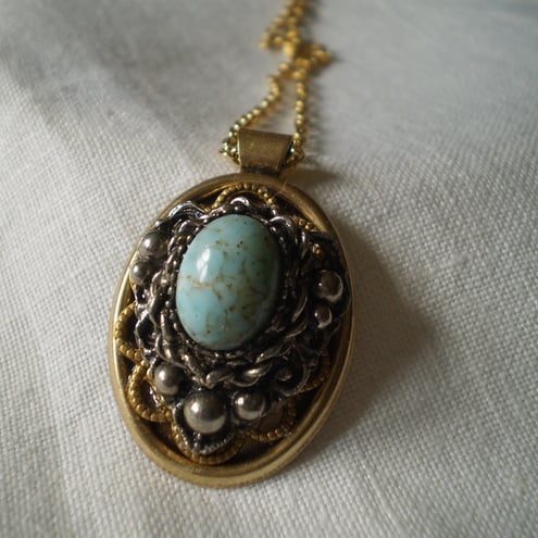 A very pretty Art Deco style cameo necklace has been created from a Vintage turquoise earring, mounted onto a antique goldtone filigree finding and placed on a pedant mount. Lovely veined blue and ornate surround make this a very delicate necklace. Hangs from a 18 inch goldtone chain and measures a demure 2.5 cms. A perfect addition to your summer jewellery collection or as a gift to someone who loves anything unusual.