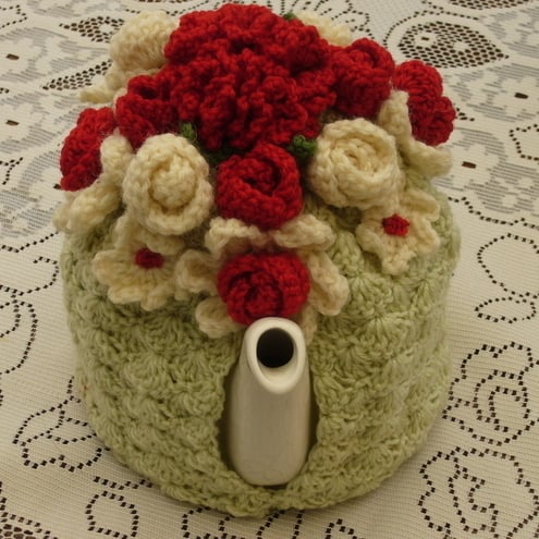 The cosy has been handmade using good quality yarn in a lovely pale green colour. The top of the cosy is decorated with a large crochet carnation in bright red with four green leaves. Around the edge of the carnation are four individual small red roses and four cream roses. There are four large cream flowers with small red rose centres and in between the large cream flowers are very pretty little flowers in cream with red crochet bobble centres.