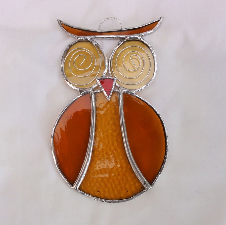 The glass used is amber water glass, amber hammered glass, light amber water glass and orange corrella glass. Each piece of glass has been copper foiled and soldered together with a generous bead of solder on the joints. Twisted tinned wire has been used to give added detail for the eyes. A ring has been attached for hanging purposes. This measures 9.5 cms x 15 cms.