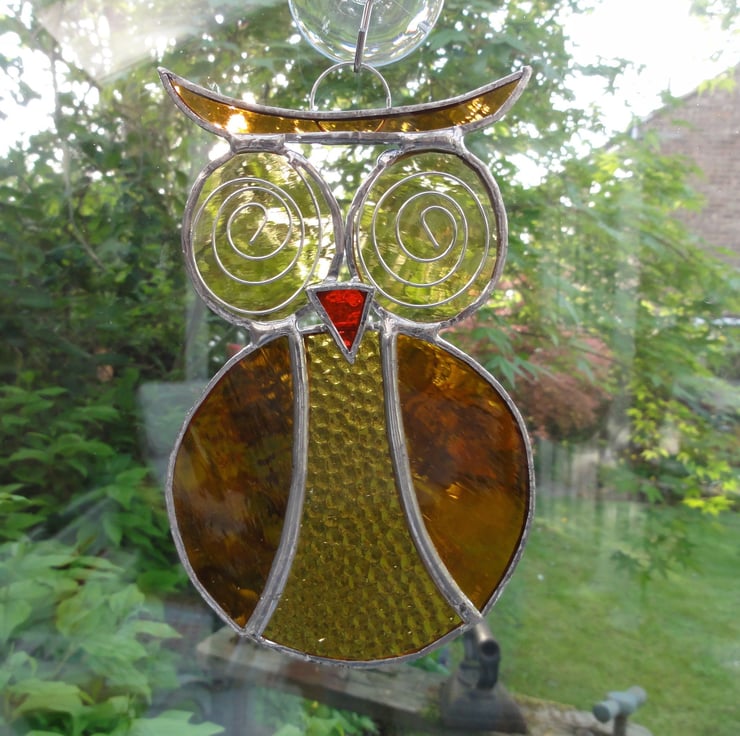 This is a beautiful owl suncatcher made out of stained glass.