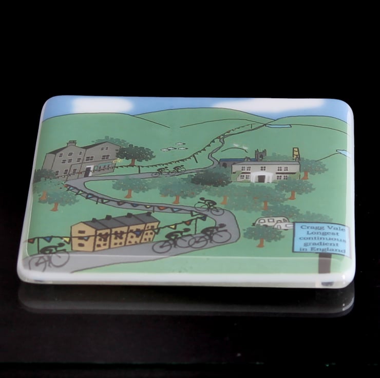 This is one of a growing set of coasters designed to celebrate the Tour de France coming to Yorkshire this July. Each coaster depicts cyclists racing through Yorkshire scenery. . Cragg Vale is famous as the longest continuous incline in England and is a road I cycle up most weekends so dear to my heart. The image depicts the two pubs on route, and the record winning bunting the residents put up for the event.