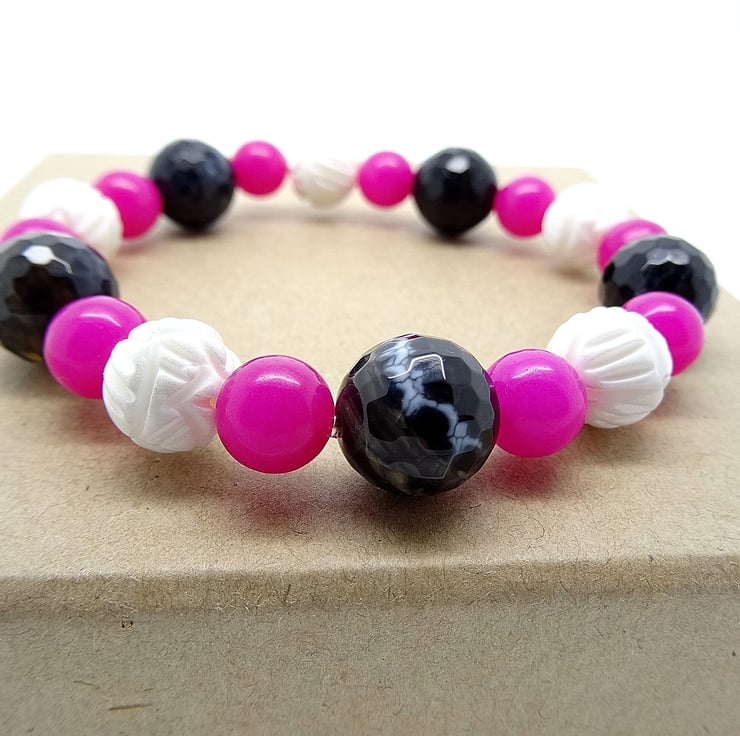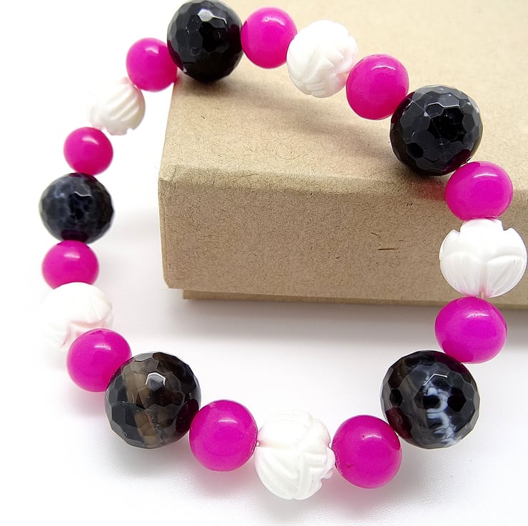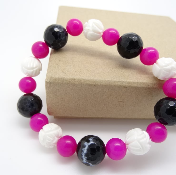This is a lovely bracelet made from faceted black marbled agate, white carved jade and pink jade beads. The bracelet is threaded onto stretchy jewellery elastic so will fit most wrists. As all of the items in my shop are individual pieces made by myself, this is the bracelet you will receive. It will arrive gift wrapped in tissue paper and a organza bag.