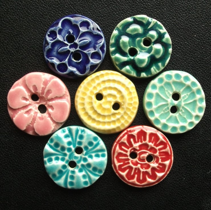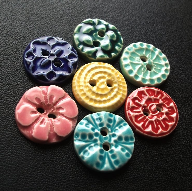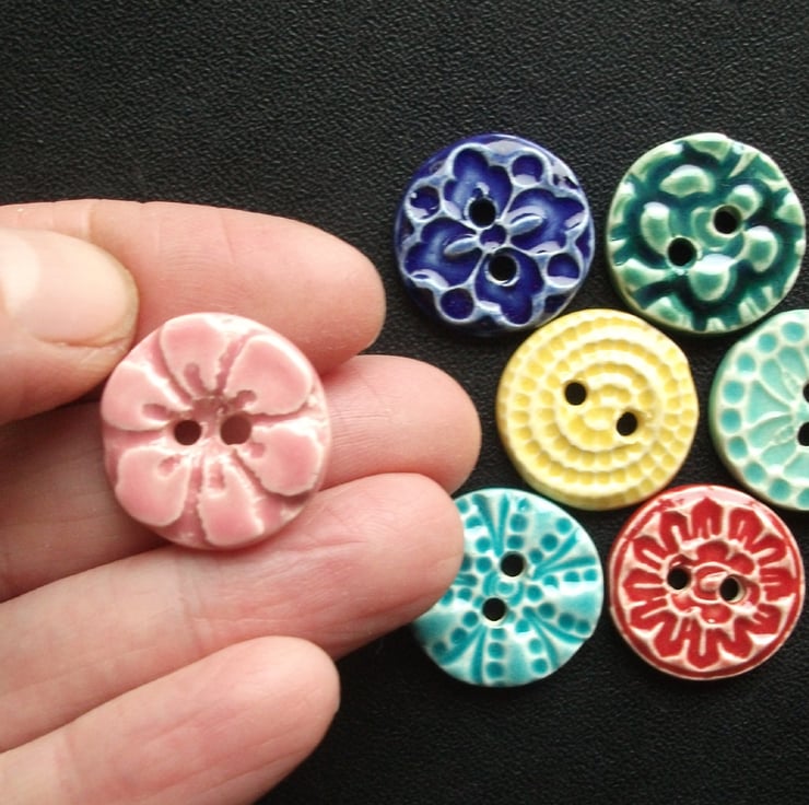 This cute little set of buttons are made from white earthenware clay and twice fired to a top temperature of 1100 degrees, so they are nice and strong.