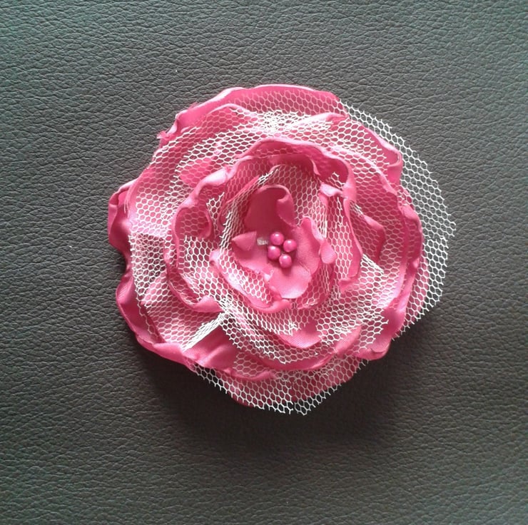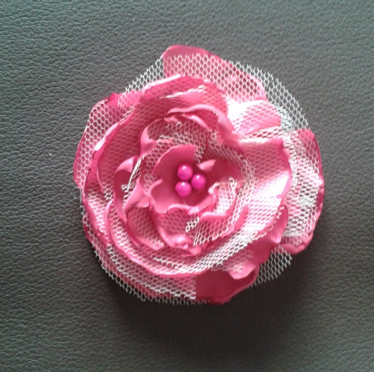 Layers of bright pink lining fabric and cream coloured net make up this gorgeous flower finished off with beautiful pink miracle beads in the centre.