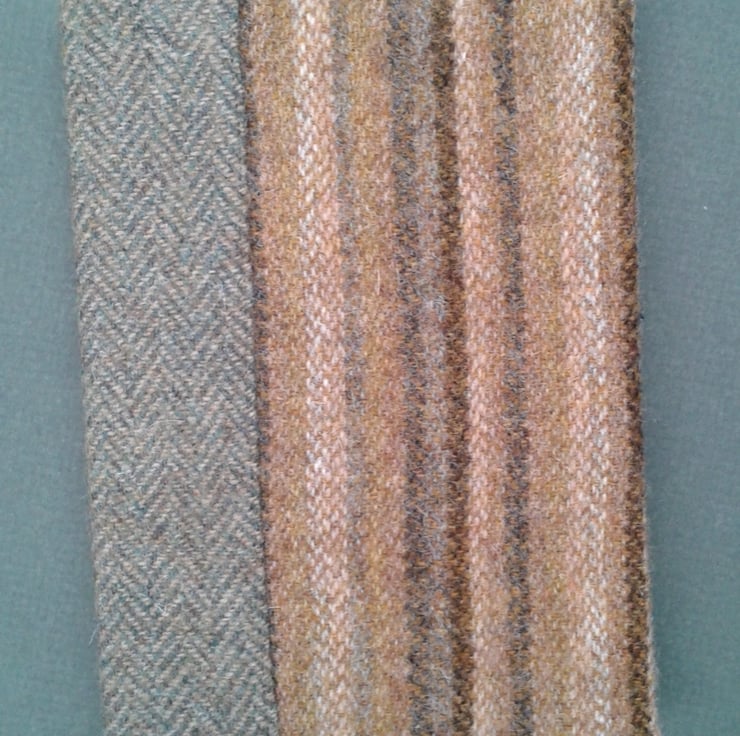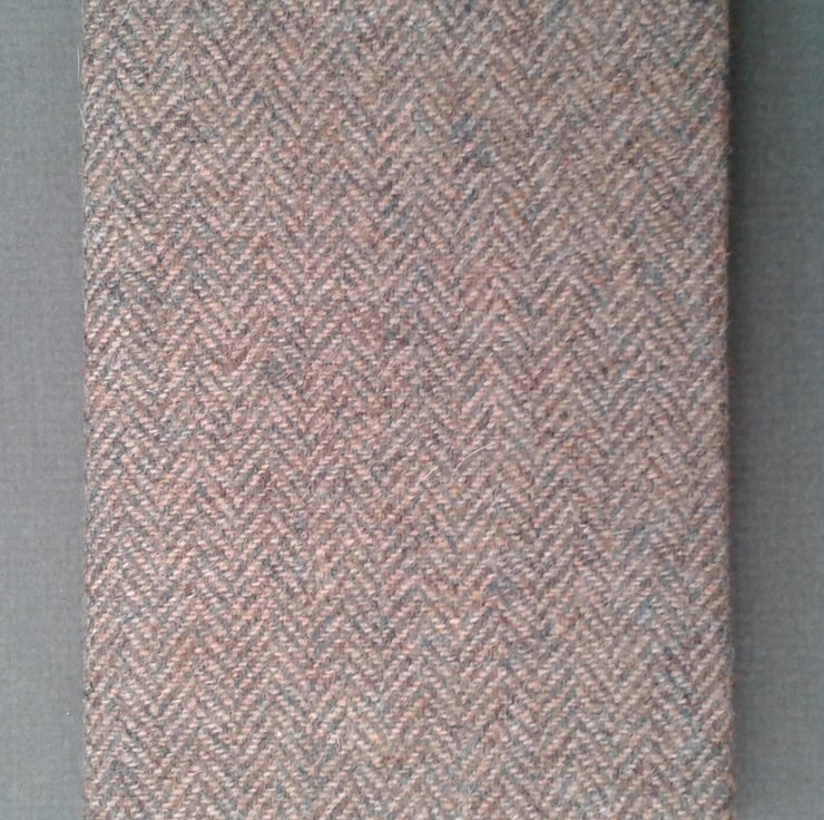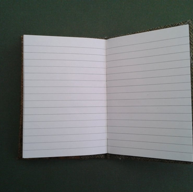 A lovely little A6 notebook with 120 lined pages. This notebook has been covered with two contrasting shetland tweed fabric designs, a striped beige/brown/olive tweed and an olive herringbone tweed.