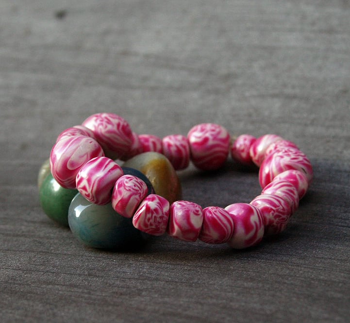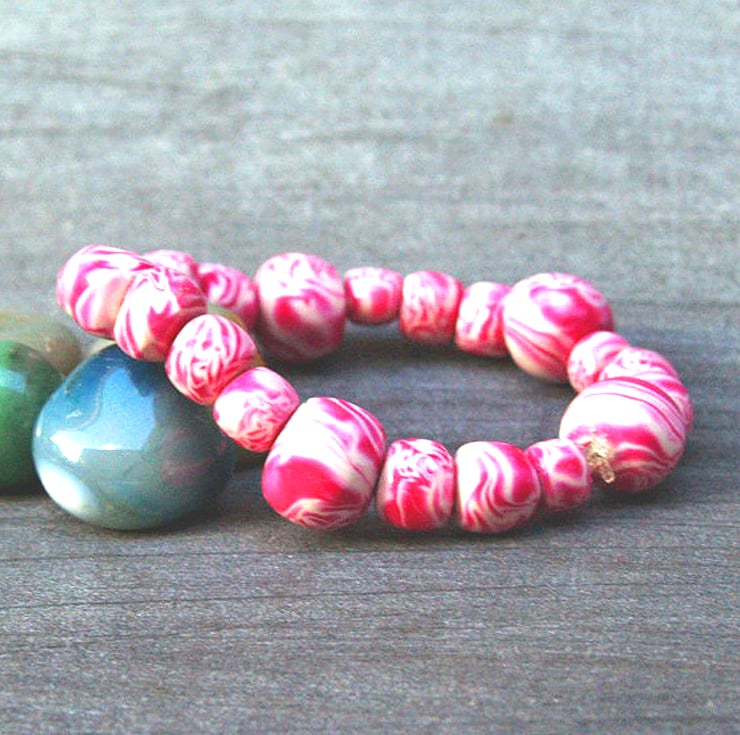 Beautiful hand-crafted beads of rich pinks in cloudy swirls of creamy whites make this a very pretty bracelet. The beads are securely threaded on stretchy elastic and the bracelet will fit medium to small wrists. They are made from polymer clay and very highly polished.