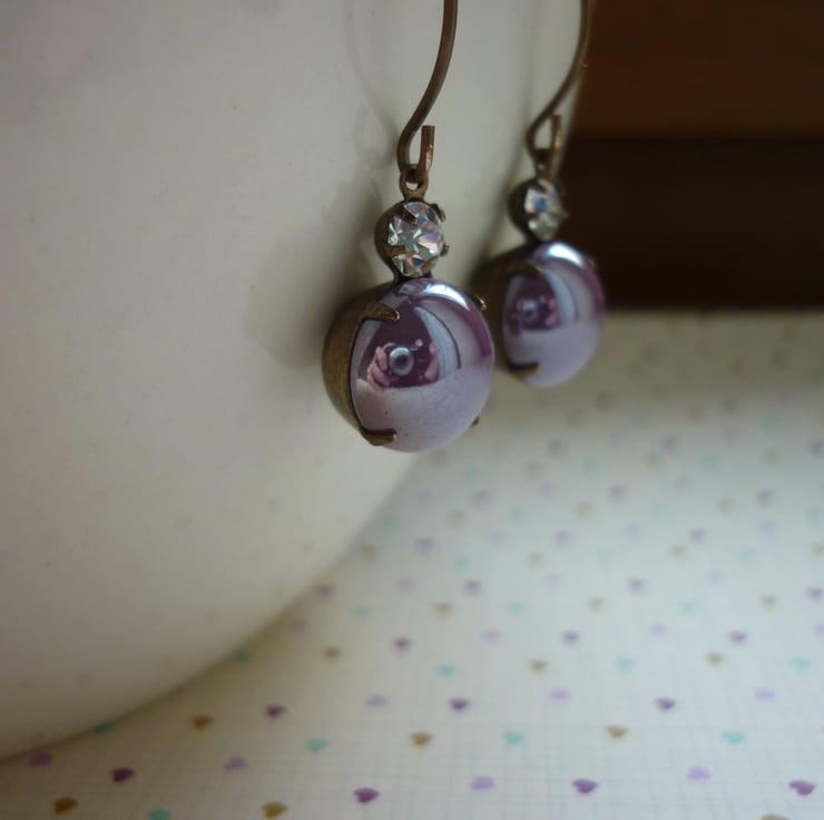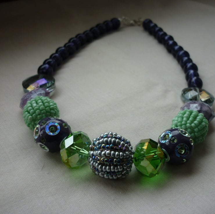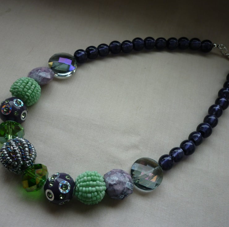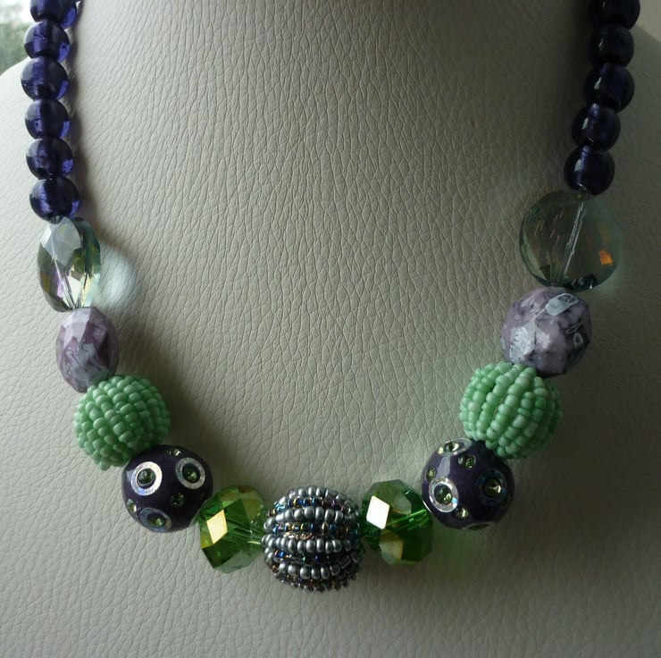 THE NECKLACE HAS BEEN MADE WITH A COLLECTION OF CHUNKY BEADS IN SHADES OF PURPLES AND SHADES OF GREENS, IN GLASS BEADS, ACRYLIC BEADS AND METAL BEADS AND FINISHED WITH SILVER FOIL PURPLE LAMPWORK BEADS, SILVER PLATED LOBSTER CLASP AND FINDINGS.