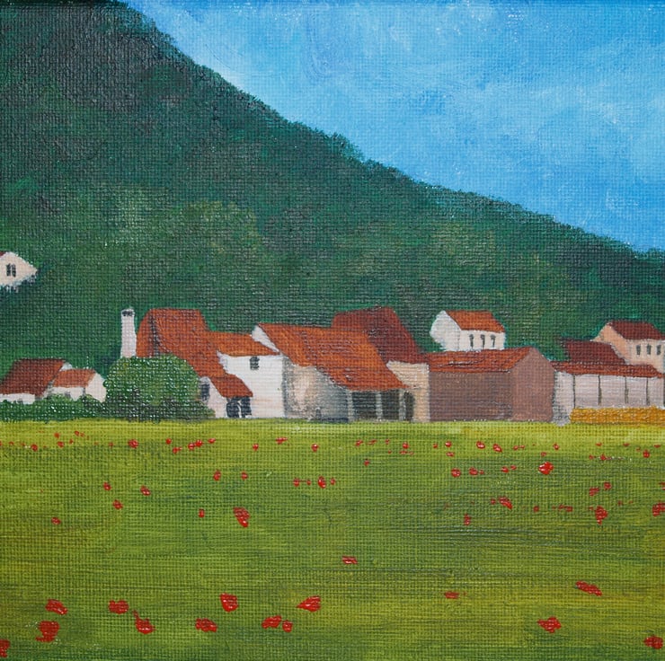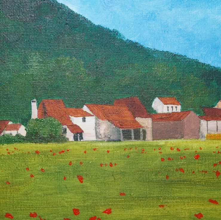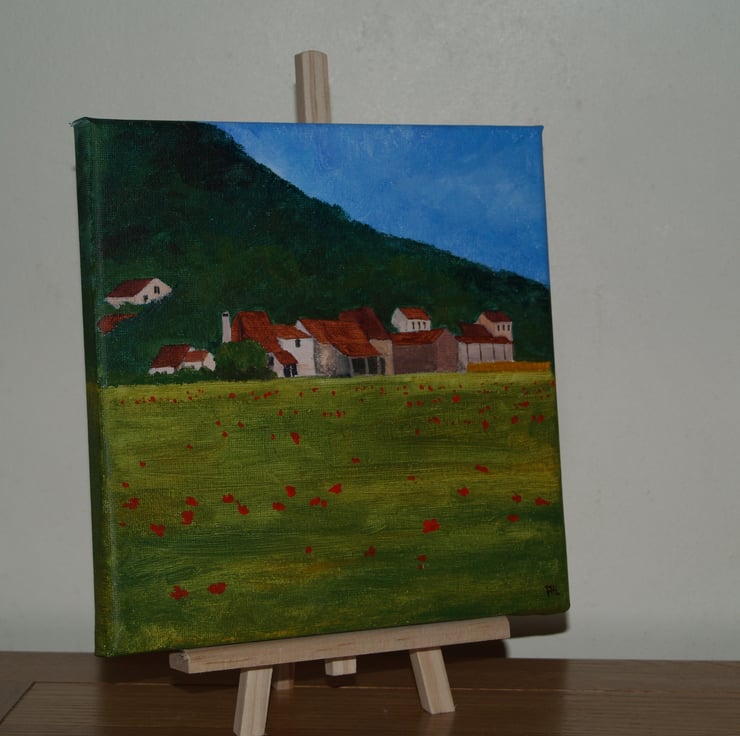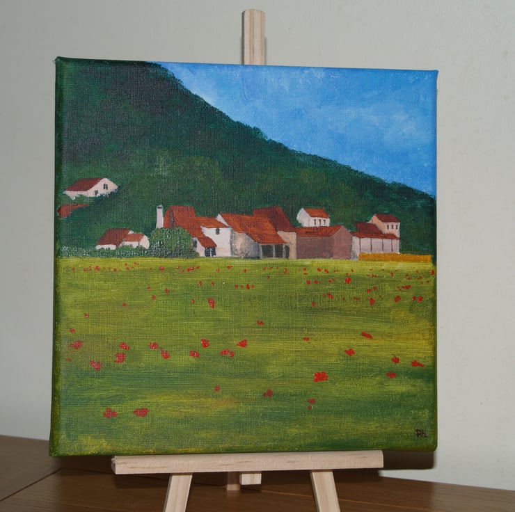 An original acrylic painting of a village in France with poppies growing amongst the crops in the fields. I have painted it on a box canvas measuring 20cm x 20cm and have continued the acrylics around each side. It does not need framing (unless you want to!) and is ready to hang.