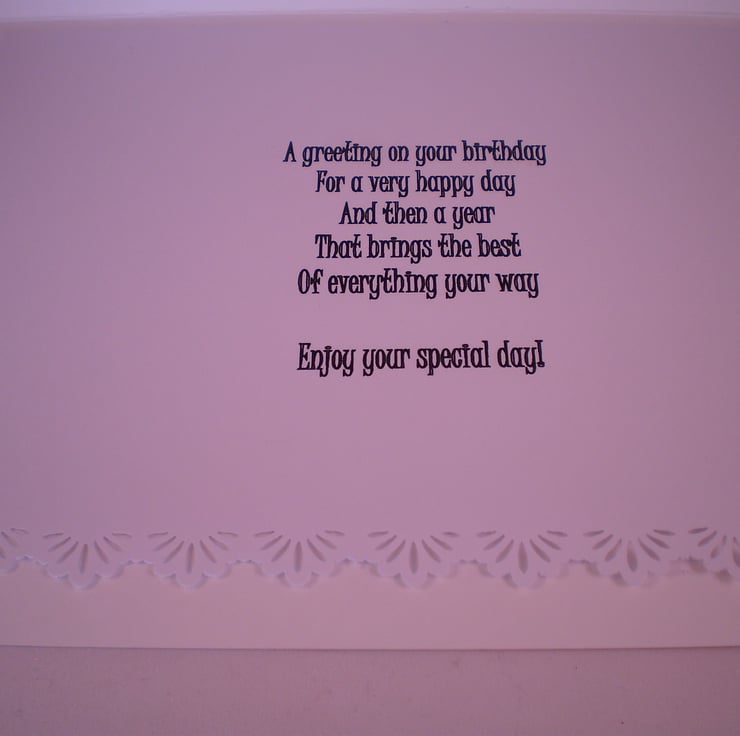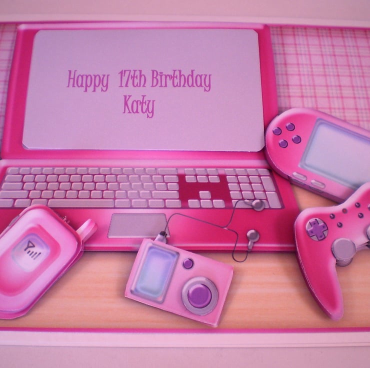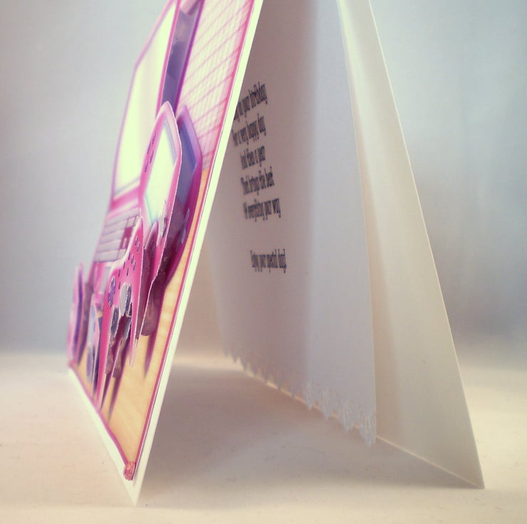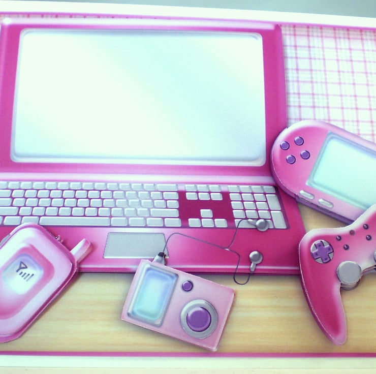 A landscape white card measuring approximately 210x150mm (8x6in) features a decoupage/3D computer with mobile phone and games console. This is a fun card and can put a message on the screen for you. It would be ideal for a female of any age. I also do one in black and grey for the boys.. Insert is white with a decorative border and a verse