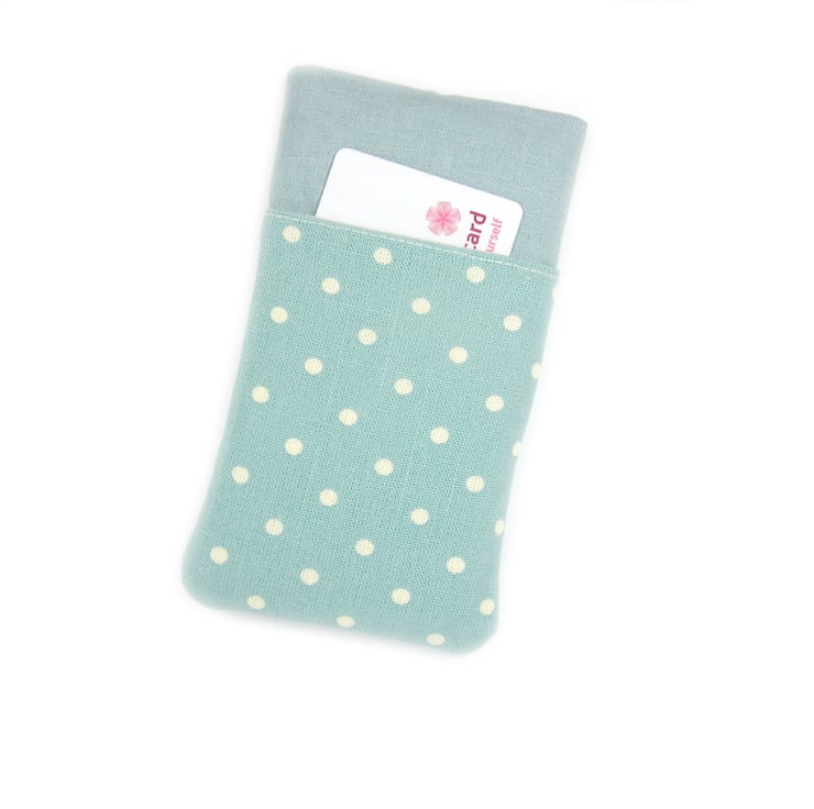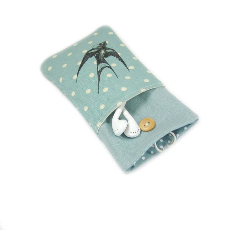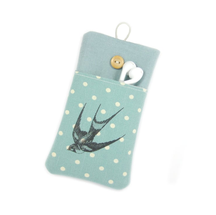 A duck egg blue, polka dot fabric phone case with a vintage swallow print on the front. Made to fit all iPhones and iPods and most android smartphones, including Nexus, Samsung Galaxy, Nokia Lumia, Sony Xperia, HTC and others.