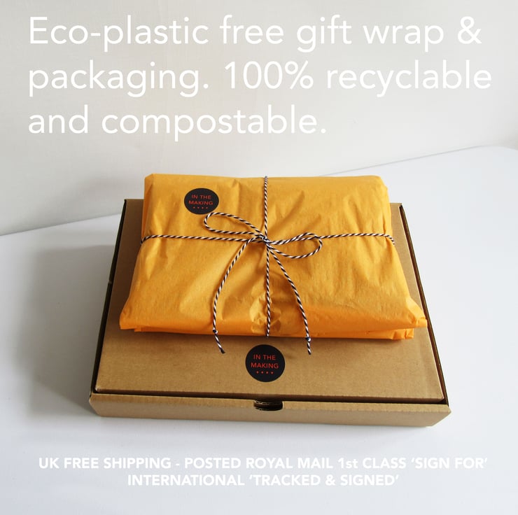 POSTAGE: Royal Mail 1st Class 'Signed For'/ International 'Tracked & Signed'. Gift wrapped and boxed: 100% recyclable paper & card, parcel tape is paper with natural rubber based adhesive fully recyclable & compostable.