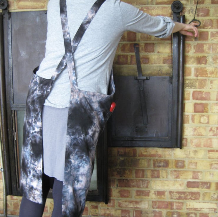 Really comfortable cross back design apron, easy-fit, with no tight ties around the body or neck, or dangly ties coming undone at crucial moments when your hands are completely covered in 'muckiness'! Each one of these aprons has a unique set of markings and spots of paint etc add even more character to this tie dye fabric!