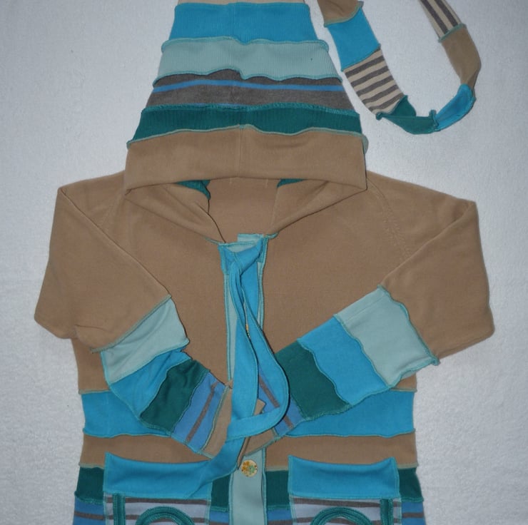 The jumpers are really soft and cosy, and have been carefully selected in shades of beige and turquoise. There is a long hood, 2 decorative patch pockets, neck ties and a button band closure with painted wooden buttons.