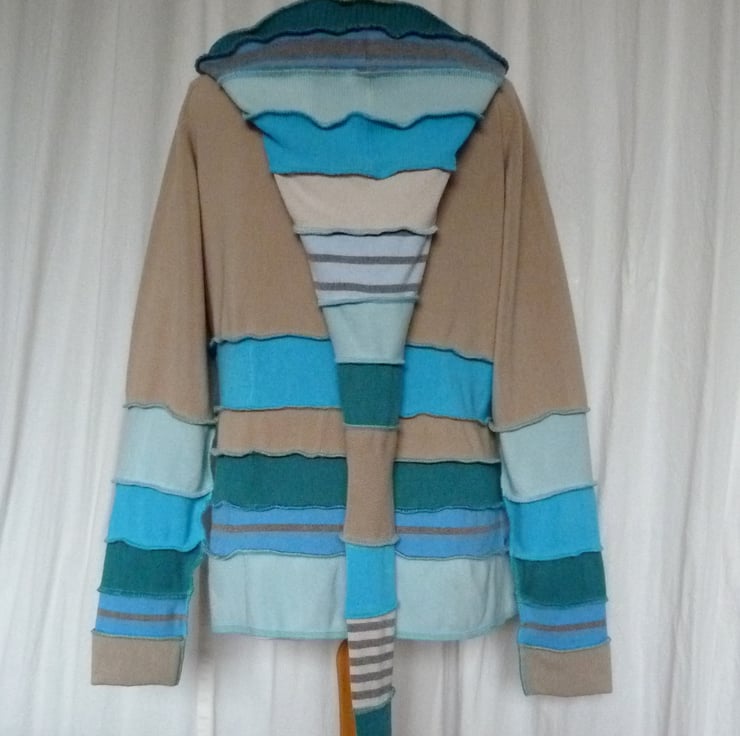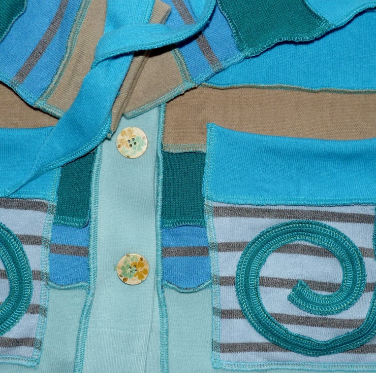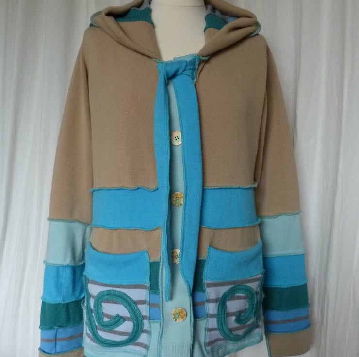 This fantastic up-cycled jacket is created from cotton and acrylic jumpers. These are previously loved and recycled jumpers, that I have washed in a hot temperature and pre-shrunk. I have then cut and re-stitched the jumpers, with all seams being professionally finished with a serger/overlocker, to create this fabulous top.