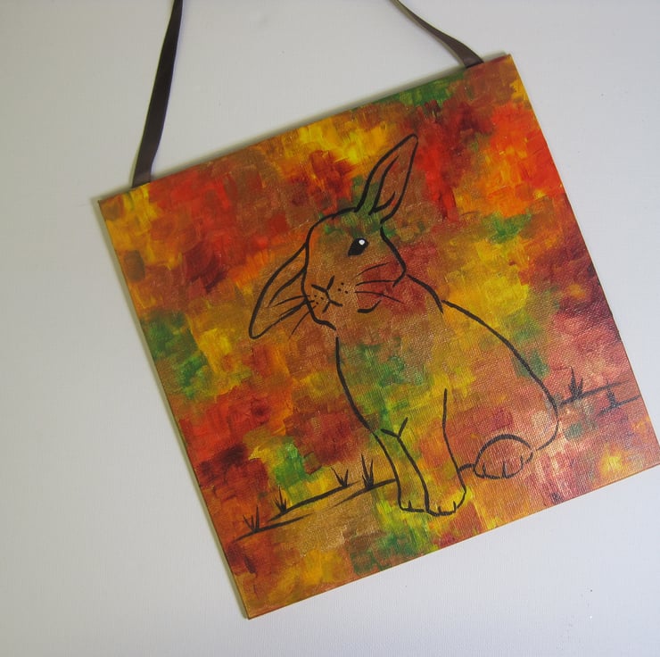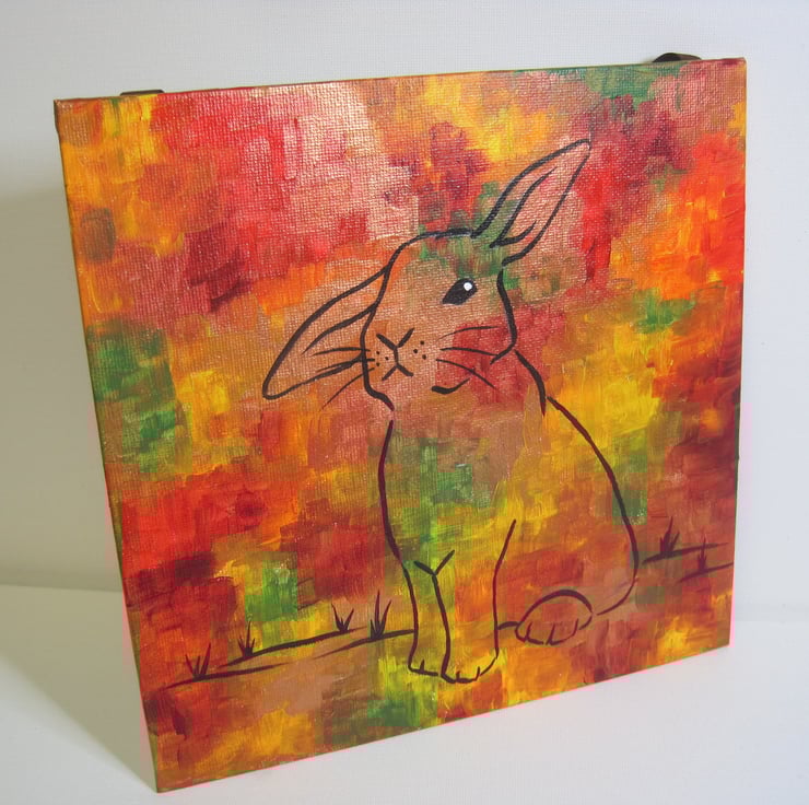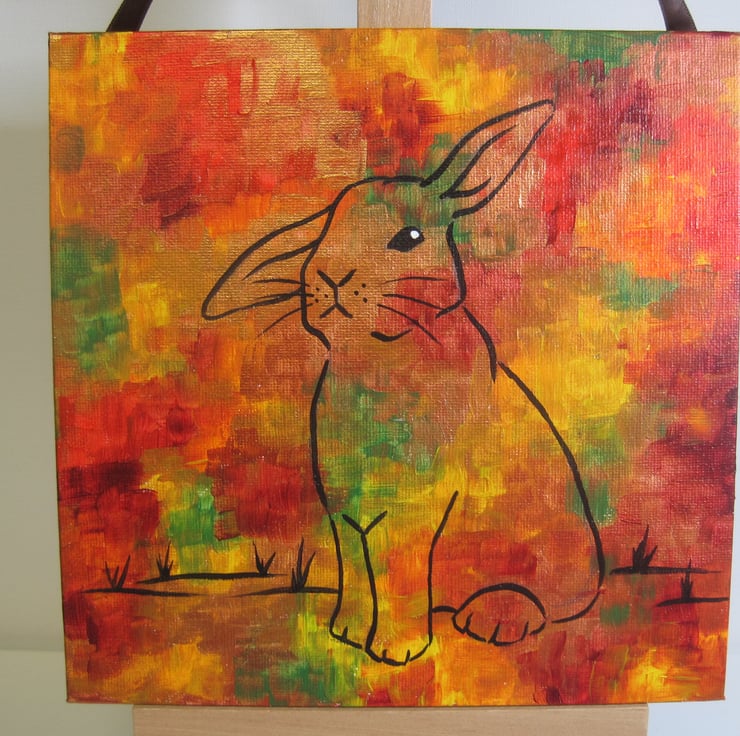 This is an original acrylic painting of bunny with helicopter ears (one up, one down) painted as a line painting on a background in autumnal shades of red, brown, gold, yellow and green.