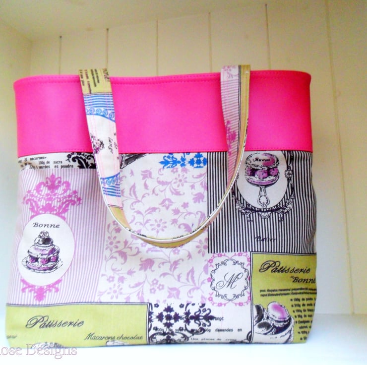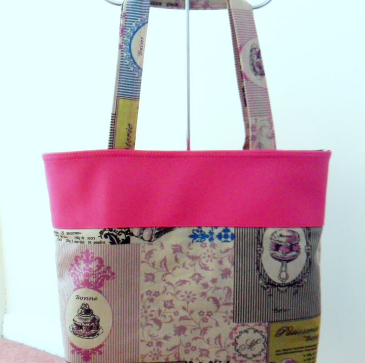 A great everyday tote handbag featuring a 'Patisserie' print fabric and with a pink faux leather top band.This roomy bag will easily accommodate an iPad, book or Kindle along with all your other essentials. It's lined in a funky pink and orange 60's print in satin and it has two inside pockets; one of them zipped. The self fabric straps are long enough to fit over the shoulder and the bag fastens with a magnetic snap. The bag is interfaced and interlined for structure and stability.