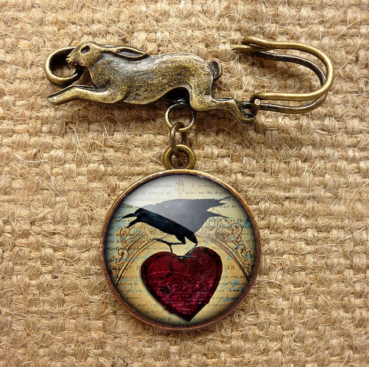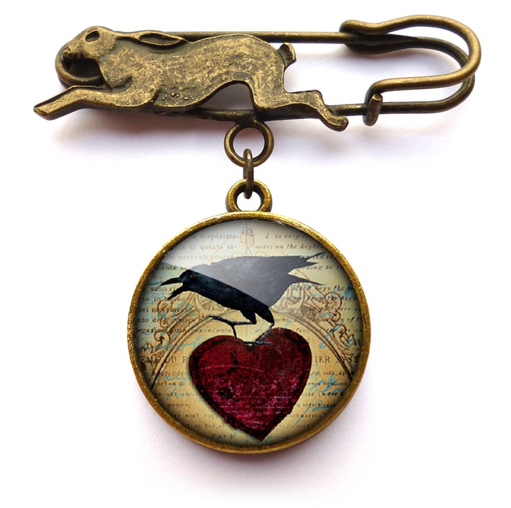 A gorgeous brooch featuring a brass hare and a digital collage of a raven and red heart on a vintage style background. This design is part of the 'Roses and Ravens' range.