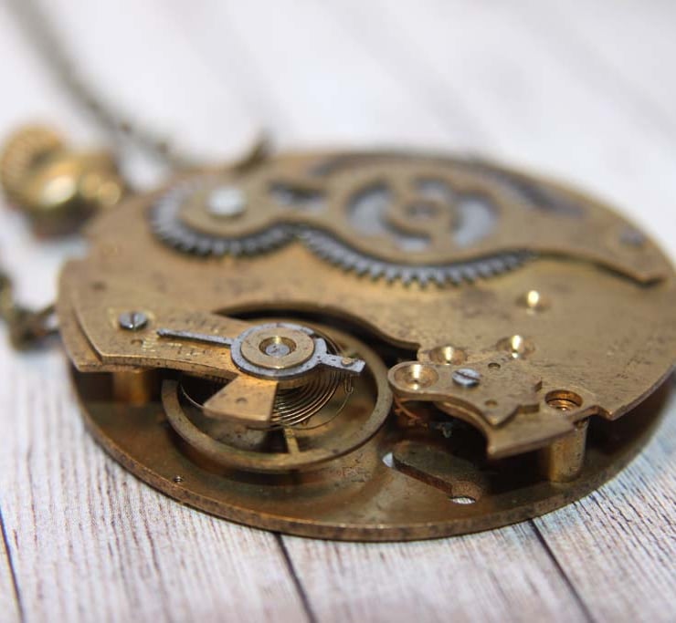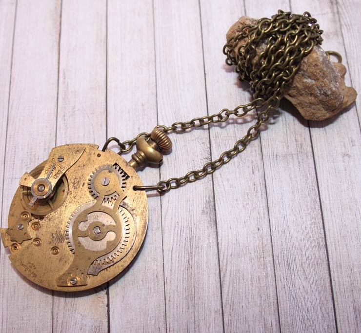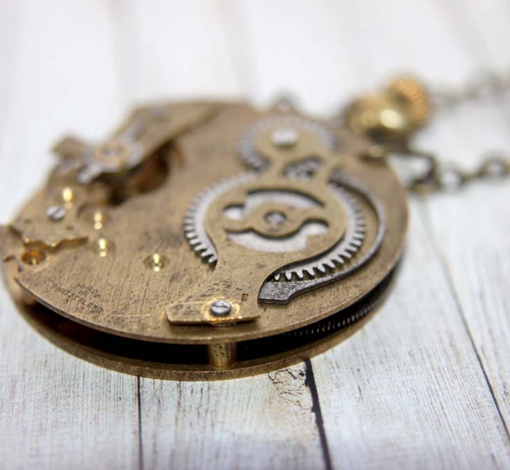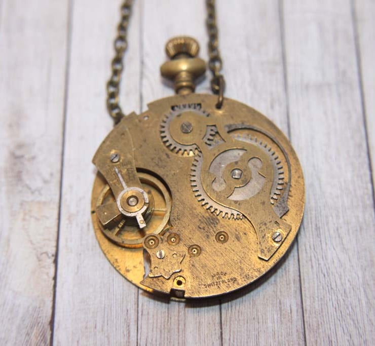 A vintage fob watch has been refashioned into a steampunk inspired statement necklace. Stamped 'Made in Switzerland', imagine this watch belonging to a travelling salesman pocketed by a young scallywag on the busy streets of London.