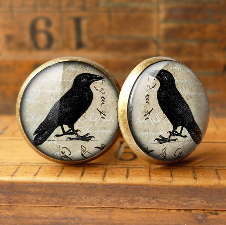 A beautiful pair of cufflinks featuring a digital collage of a raven on a calligraphy script background. This design is part of the 'Roses and Ravens' range.