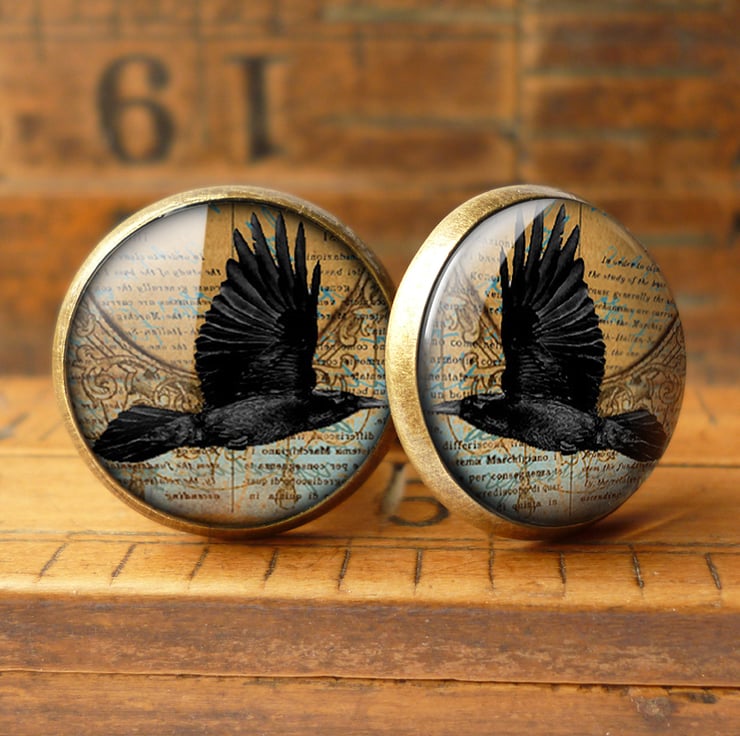 A beautiful pair of cufflinks featuring a digital collage of a raven in flight on a vintage style background. This design is part of the 'Roses and Ravens' range.