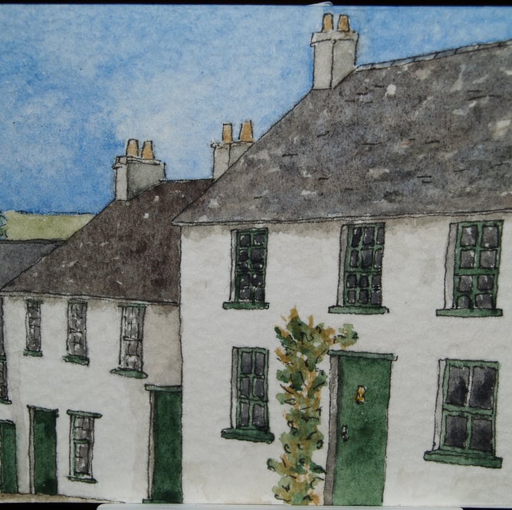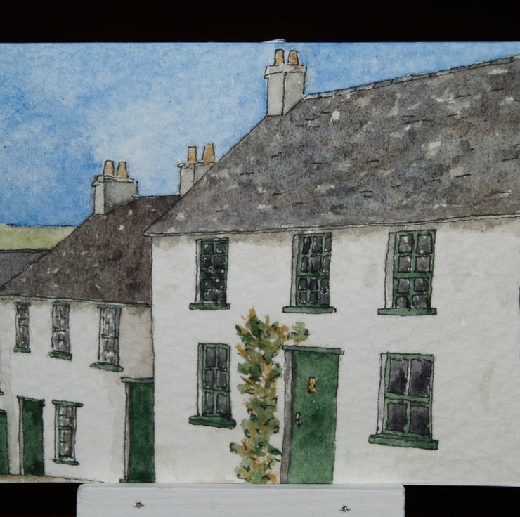 This ACEO is an original, handpainted watercolour of a row of whitewashed terraced cottages. It measures 2.5 x 3.5 inches (63 x 89mm).