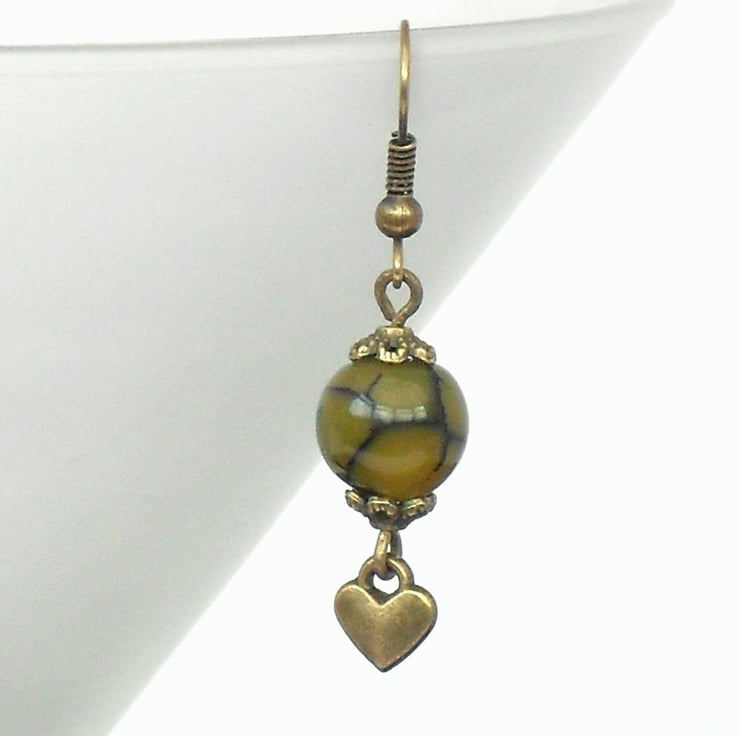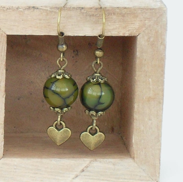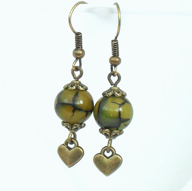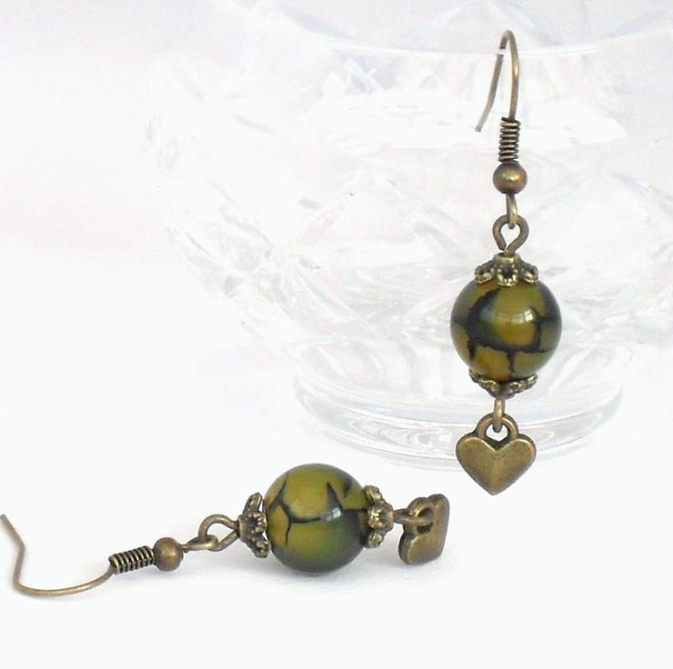 Unusual and unique olive green dragon vein agate earrings, made with bronze heart charm and beadcaps.