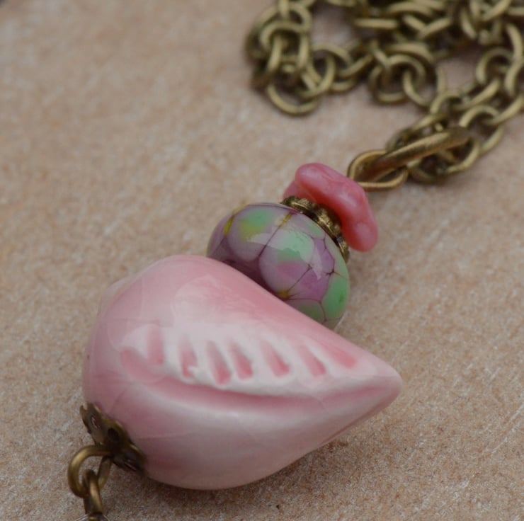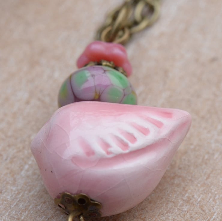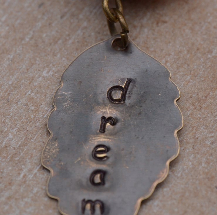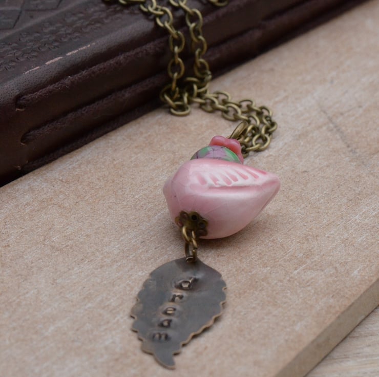 I have hand stamped a Vintaj brass leaf with the word "dream" and above it added a beaded nest of a ceramic pink bird, a purple, pink and green lampwork glass bead and a pink Czech flower cup bead. The necklace is finished with antique bronze plated chain with a trigger clasp.