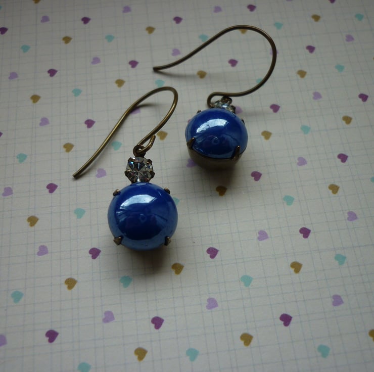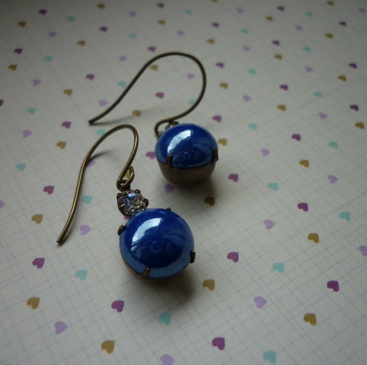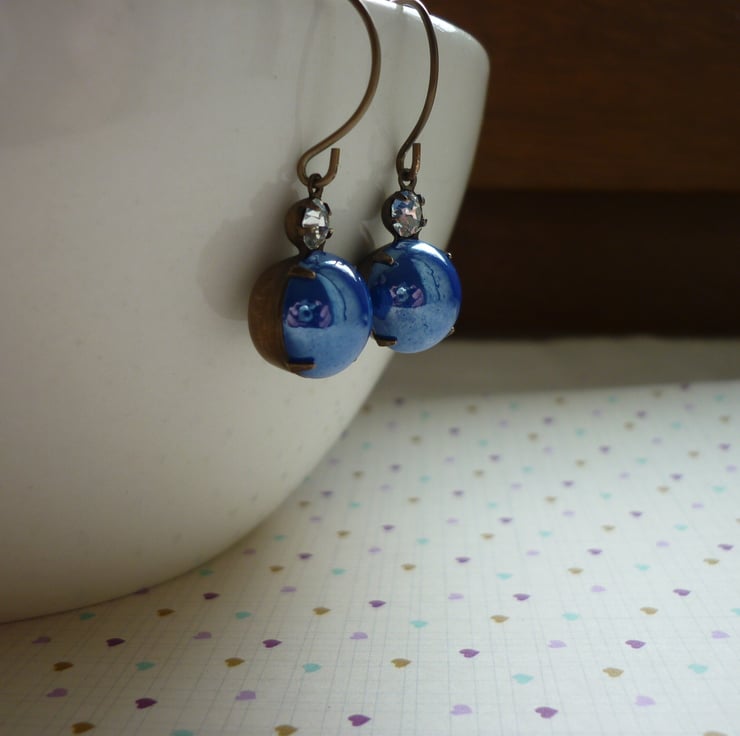 THE EARRINGS HAVE BEEN MADE WITH A HALF MOON SHAPED GLASS STONE IN MONTANNA BLUE ALONG WITH A CLEAR FACETED CRYSTAL BOTH SET IN A PATINA BRASS SETTING AND FINISHED WITH NATURAL VINTAJ BRASS ROUND LOOP EAR WIRES.