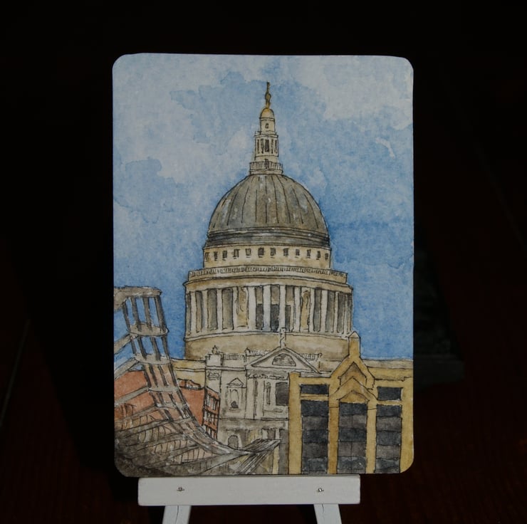 This ACEO is an original, handpainted watercolour of St. Paul's Cathedral and the Millennium Bridge in London. It measures 2.5 x 3.5 inches (63 x 89 mm).
