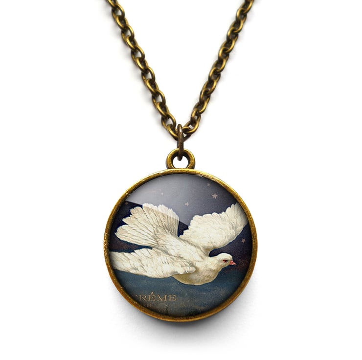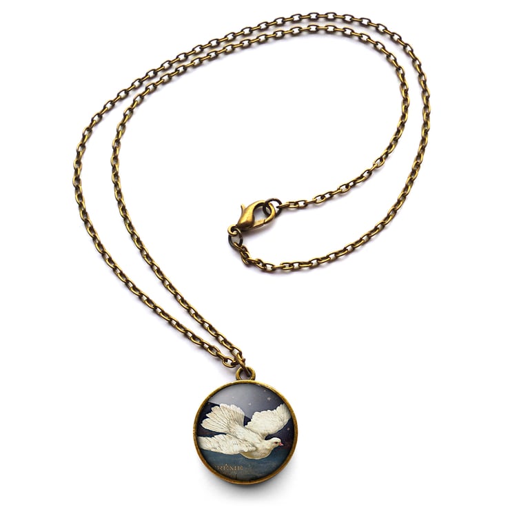A gorgeous necklace featuring a vintage dove illustration from a Victorian postcard. This design is part of the 'Eclectic Range'.