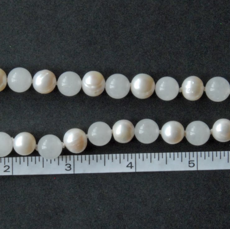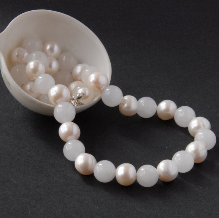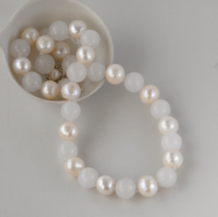 Chunky (10mm) creamy white cultured pearls are inter spaced with white jade in this classic statement necklace. Each bead is individually knotted on silk and finished off with a sterling silver clasp and extender chain.