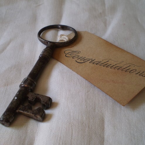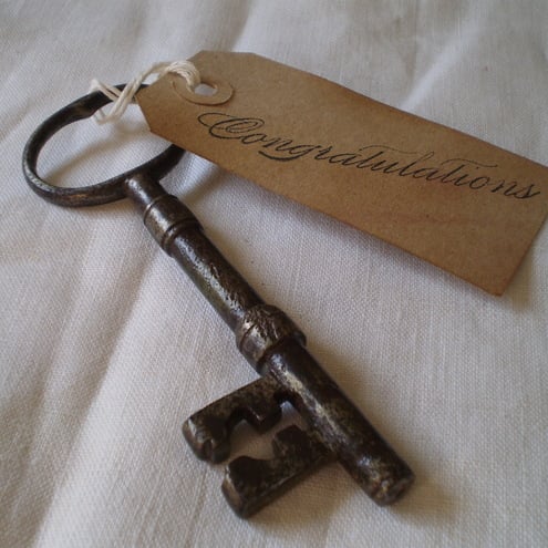 This is quite literally "The Key of the Door"... A wonderful antique key that measures an impressive 5 inches long with fantastic workmanship. What kind of door did this unlock a long time ago, a door to an impressive dwelling no doubt. The key has a hand distressed and stamped gift tag attached, with the word Congratulations. This would make a great New Home idea, to the gift of your choice... or for an alternative 21st or 18th birthday for someone who like the unusual. If you would like the tag to say Best Wishes... or Celebrate ... please let me know
