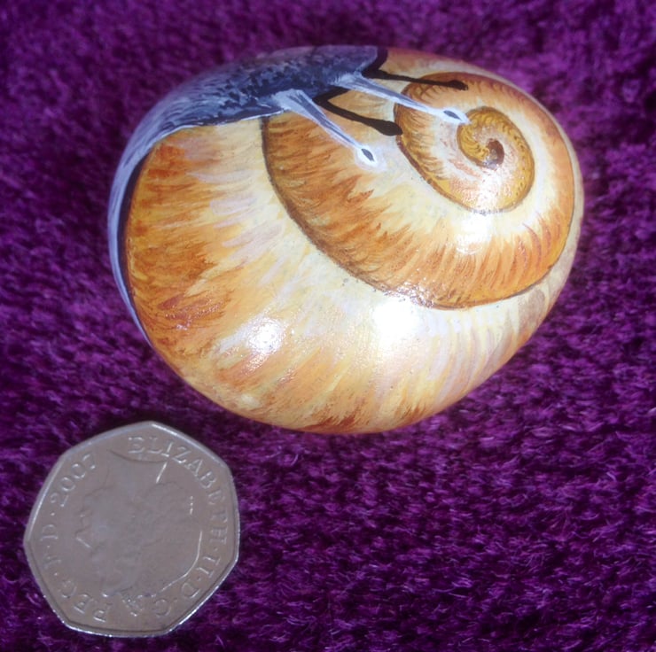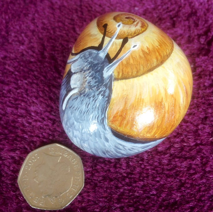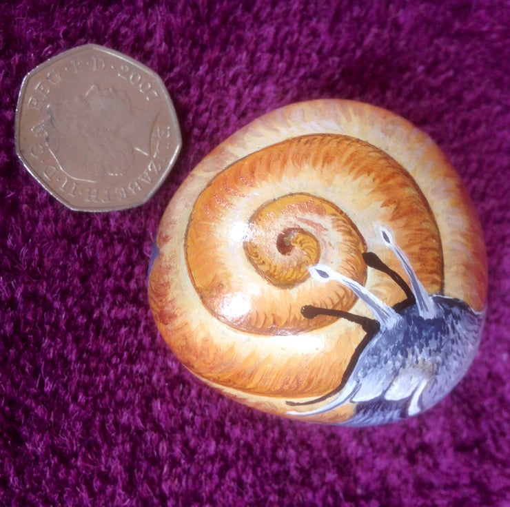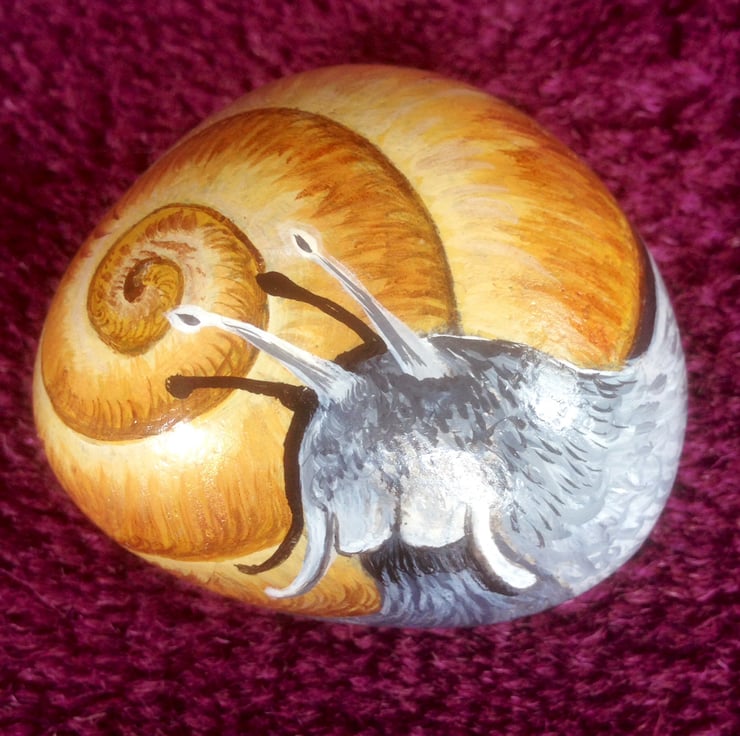 This little snail has been painted onto a shaped rock and glazed for a glossy protective finish