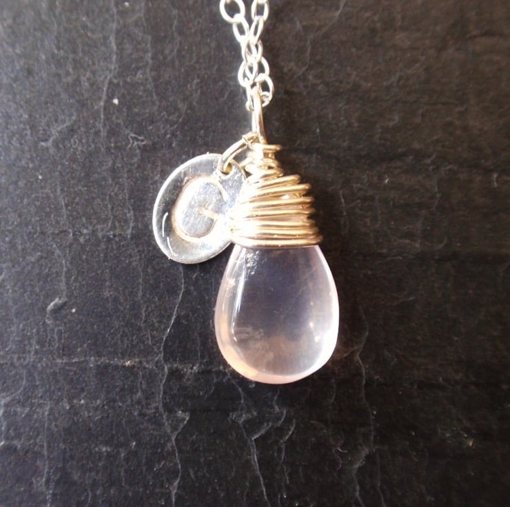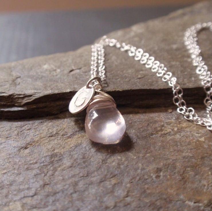 The pretty smooth rose quartz is a teardrop shape. The pendant itself is around 1.4cm long and i have messy wire-wrapped it in sterlng silver wire to add interest.