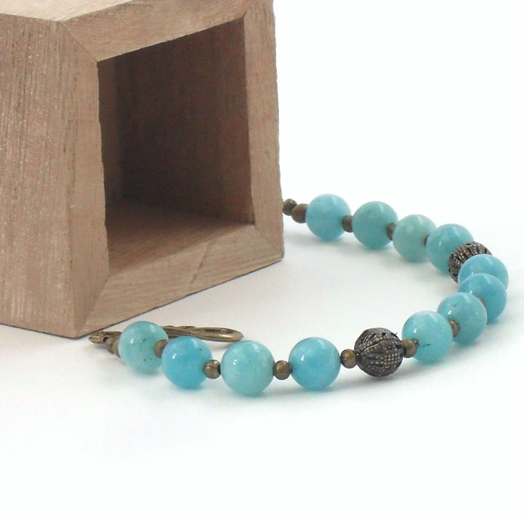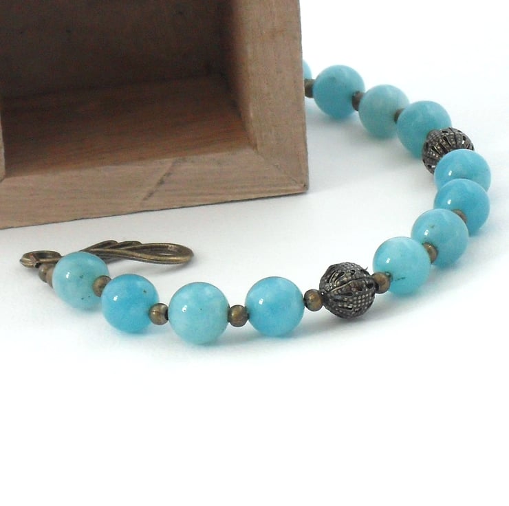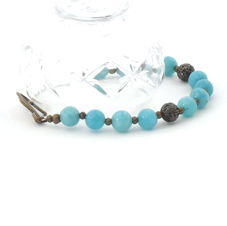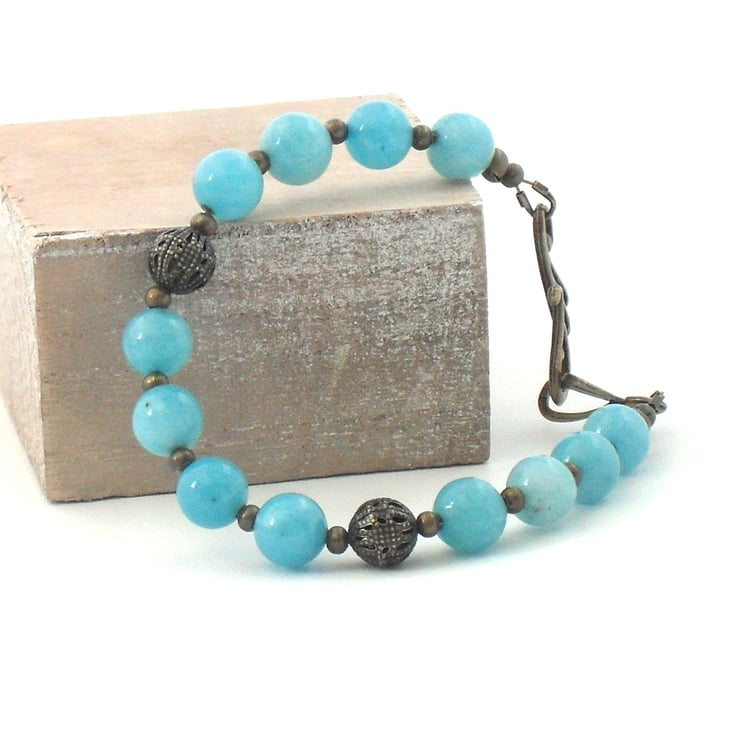 Beautiful 8 mm blue jade rounds are complemented by pretty ornate bronze beads and a lovely 'swirly' clasp.