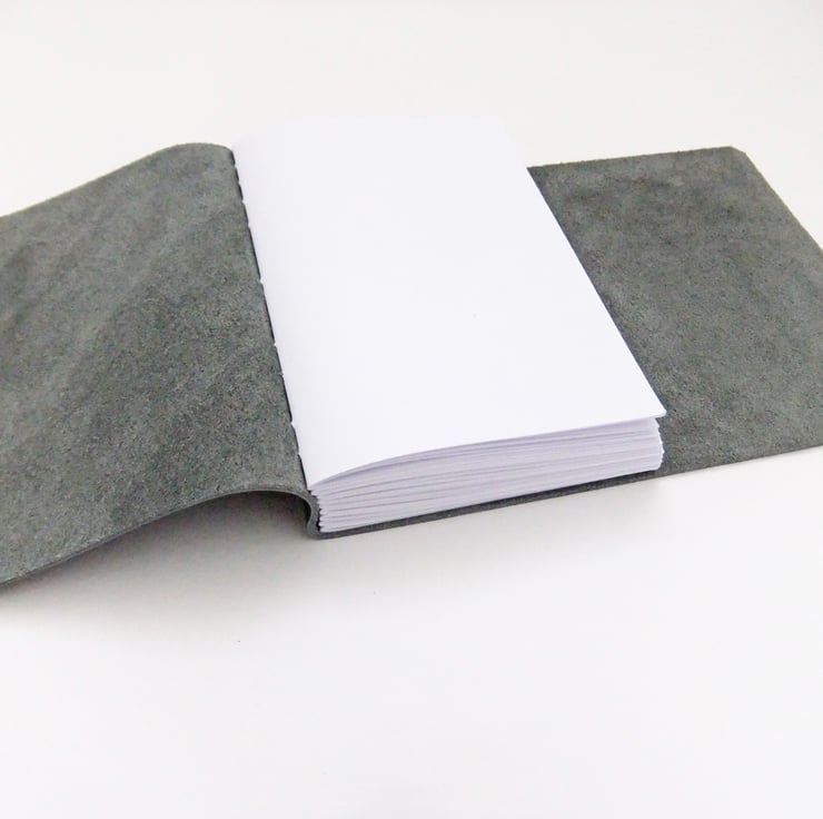 - the journal has an environment-friendly, high quality soft, tough grey leather cover with lovely grain and leather smell. The inside is soft suede. Our leather comes from a Scottish luxury furniture maker. We use pieces that are too small for his furniture so that none of this gorgeous leather goes to waste.