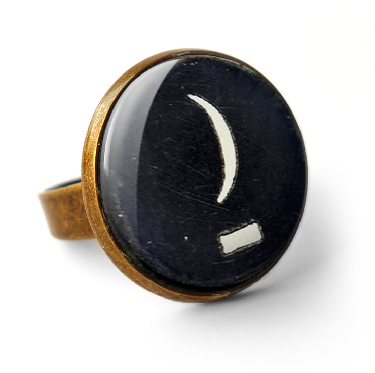 A gorgeous ring featuring a close-up photograph of a vintage typewriter key. This design is part of the 'Dark Journey' range.