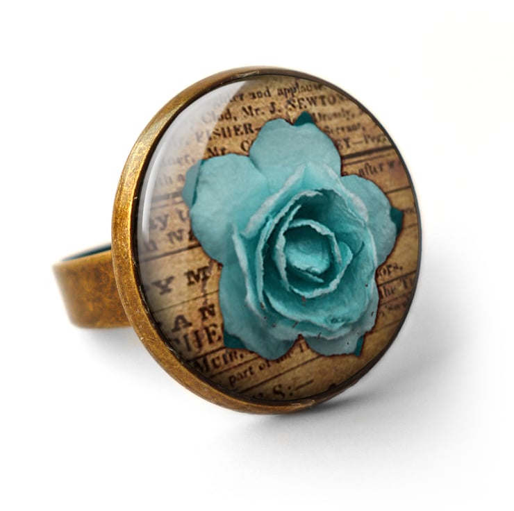 A gorgeous ring featuring a digital collage of a blue rose on a vintage newspaper background. This design is part of the 'Roses and Ravens' range.