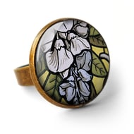 A gorgeous ring featuring a digital collage of a raven and red heart on a vintage style background. This design is part of the 'Roses and Ravens' range.