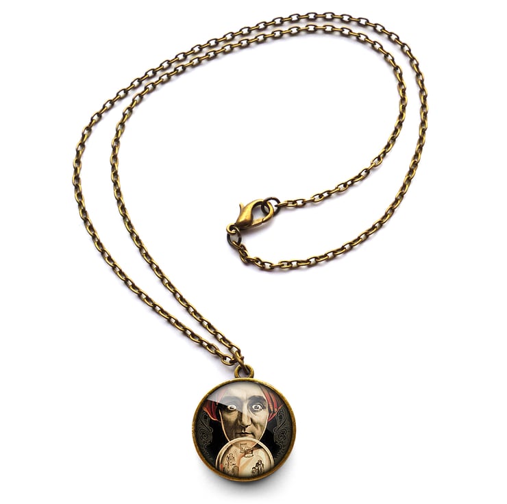 A gorgeous necklace featuring a wonderful vintage image of a fortune teller gazing into a crystal ball. This design is part of the 'Dark Journey' range.