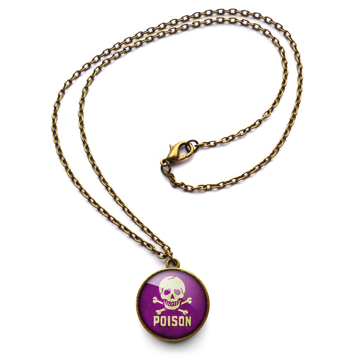 A gorgeous necklace featuring an image of a vintage poison warning. This design is part of the 'Dark Journey' range.